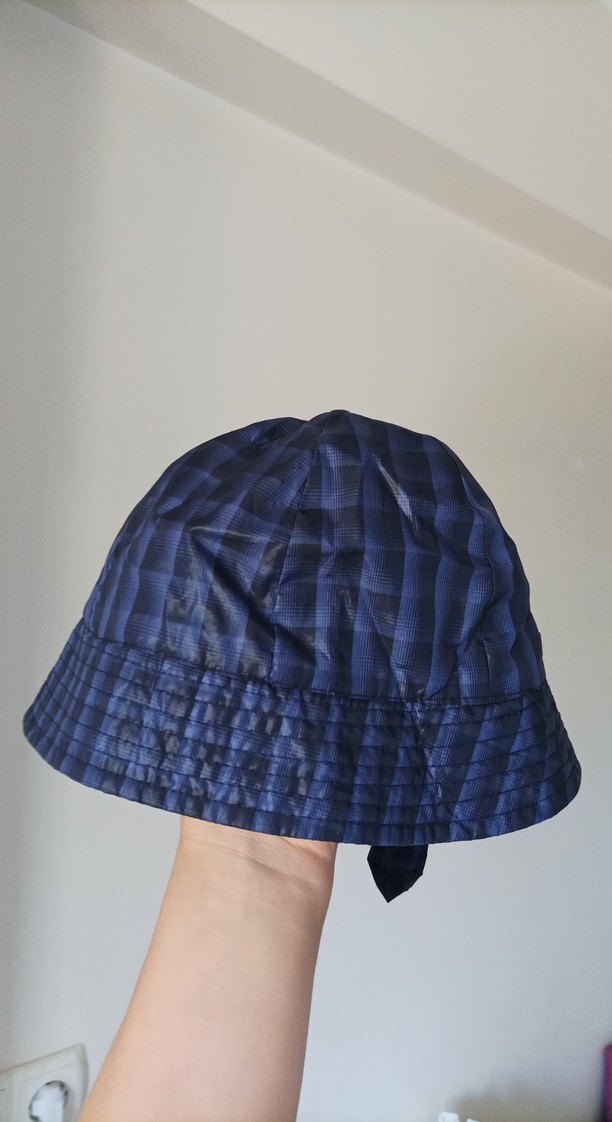 Lacivert, hafif parlak ve yumuşak dokulu, kare desenli, rahat kesimli çocuk şapka.