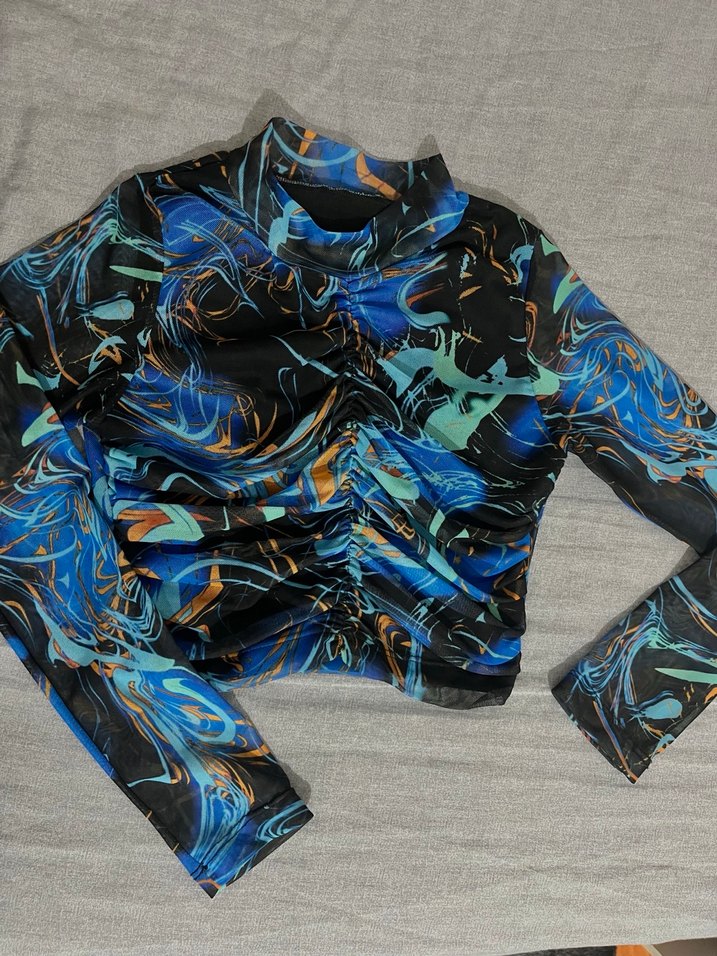Kadın desenli lacivert crop hic giyilmemiştir tertemizdir sadece kolları teni gösterir diğer bölümler göstermez önü büzgülü arkası düzdür. Xs-S bedendir