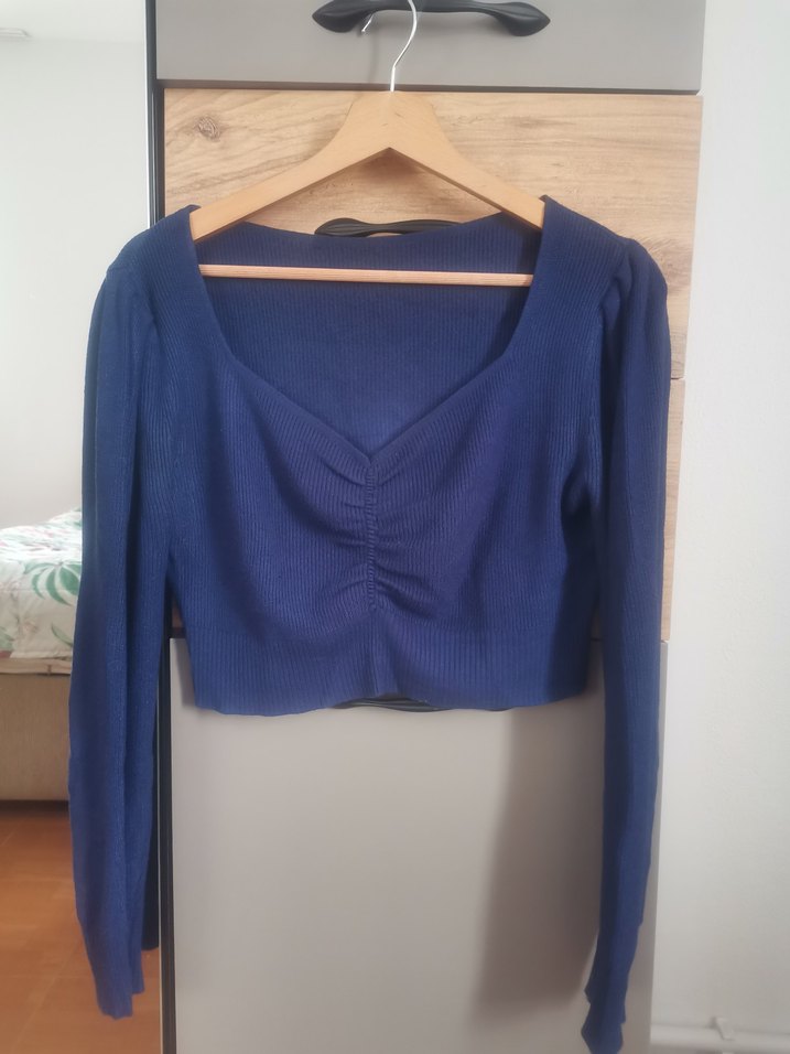 Lacivert Crop V Yaka Büzgülü Triko Kazak