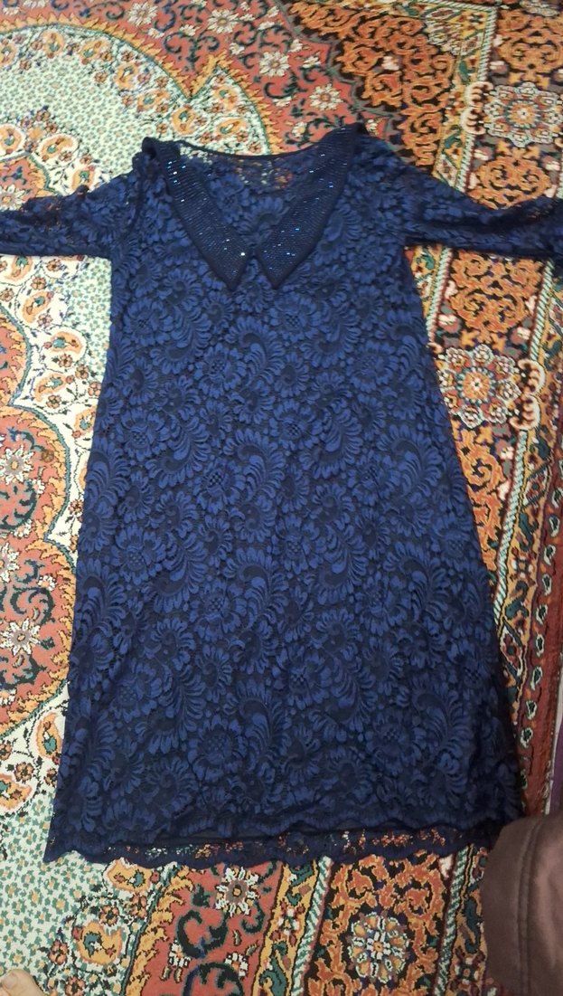 Uzun lacivert dantel kumaştan, v yaka ve uzun kollu, bohem tarzda oturan kesim abiye elbisedir. Partiler için uygundur.