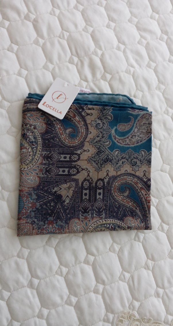 Yumuşak sentetik kumaştan, dantel detaylı lacivert bohem desenli şal. Etiket üzerinde 'LOCELLA' yazıyor.