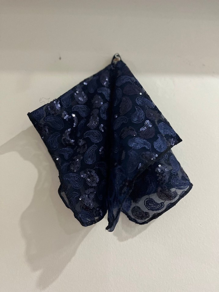 Kadınlar için lacivert sentetik kumaş üzerine dantel ve hafif payet detayları bulunan, Özel günlerde eğlenceyi artıracak halay mendili. Bir kez kullanıldı. 2 adet vardır. Özel yapım kendimiz tasarladık yaptık. Bir kez kullanıldı.