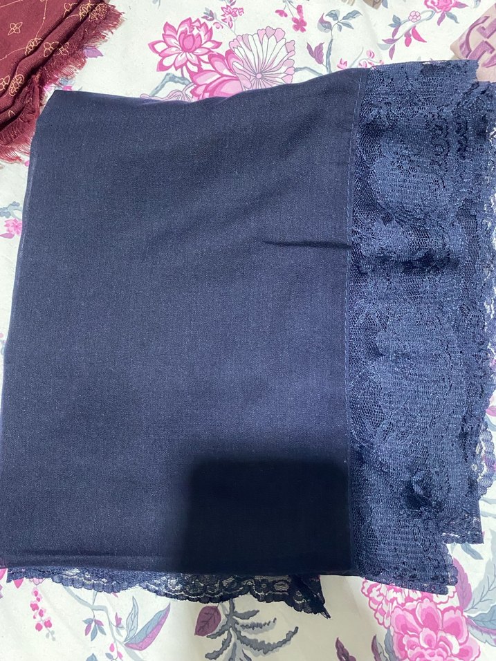 Lacivert renkte, yumuşak sentetik kumaştan yapılmış, dantel detaylı kadın şal. Rahat ve sade bohem tarzı sunar.
