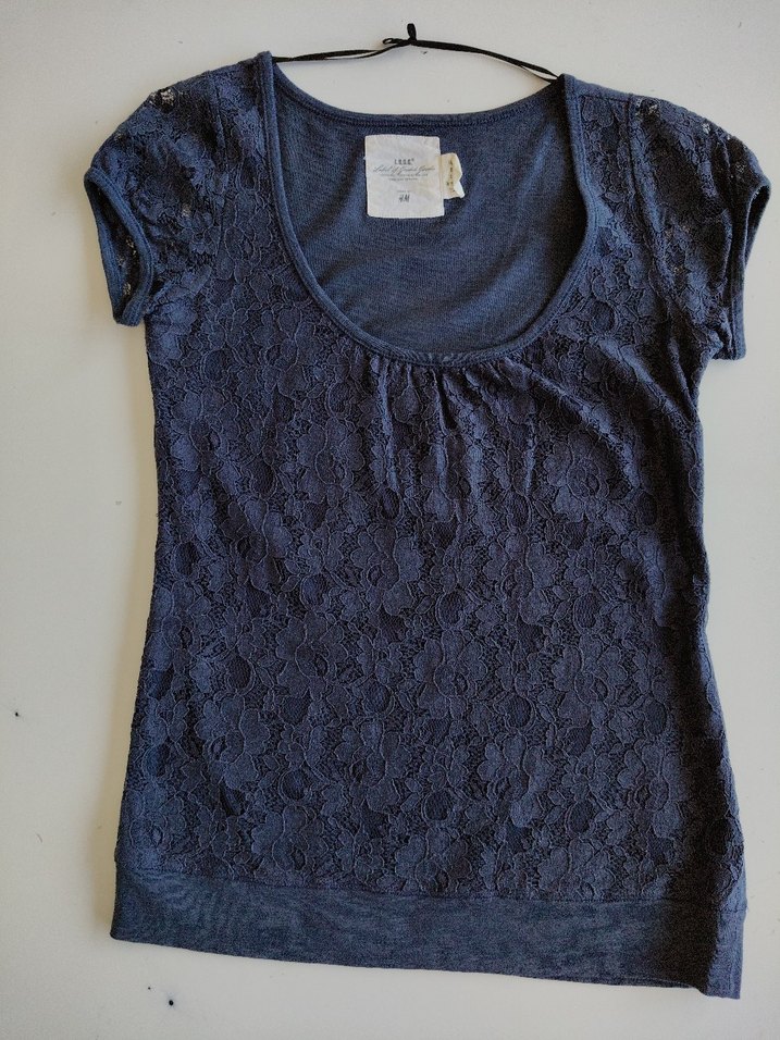 Kısa kollu, yuvarlak yakalı, dantel detaylı lacivert denim bluz, vücuda oturan kesimde ve normal boyda, gündelik gotik tarz için uygun.