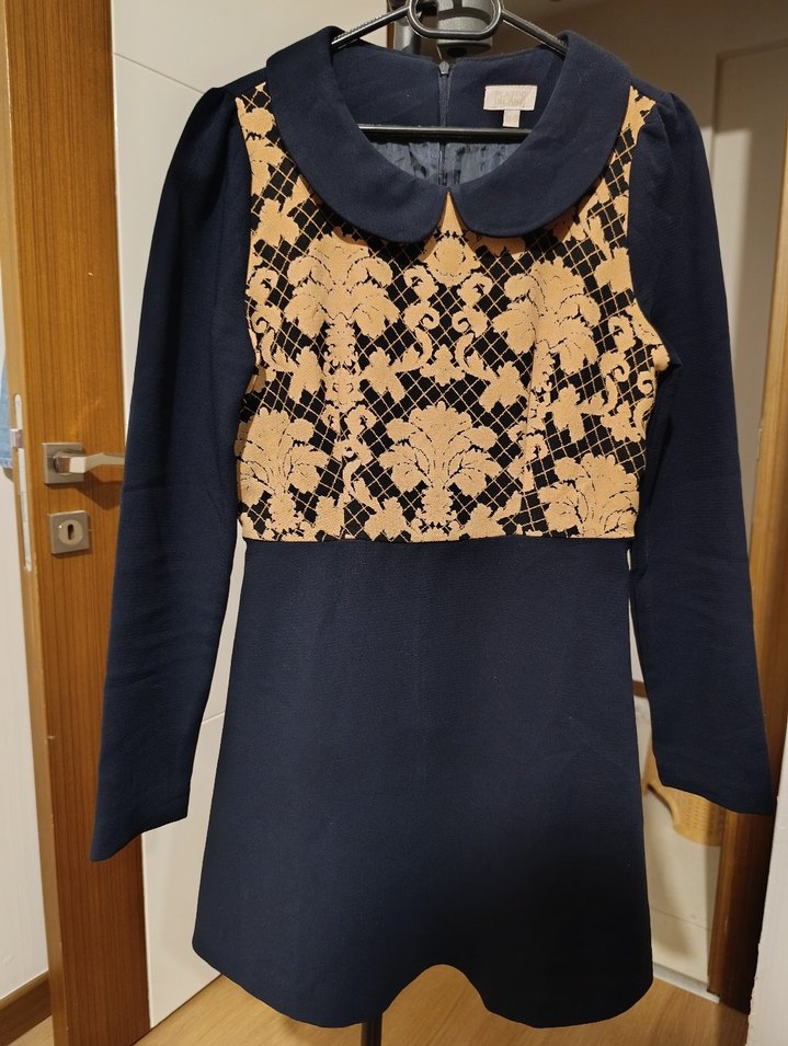 Lacivert kumaş ve bej dantel baskılı vintage gotik tarzda, yakalı ve uzun kollu, klasik şıklıkta oturan midi elbise.