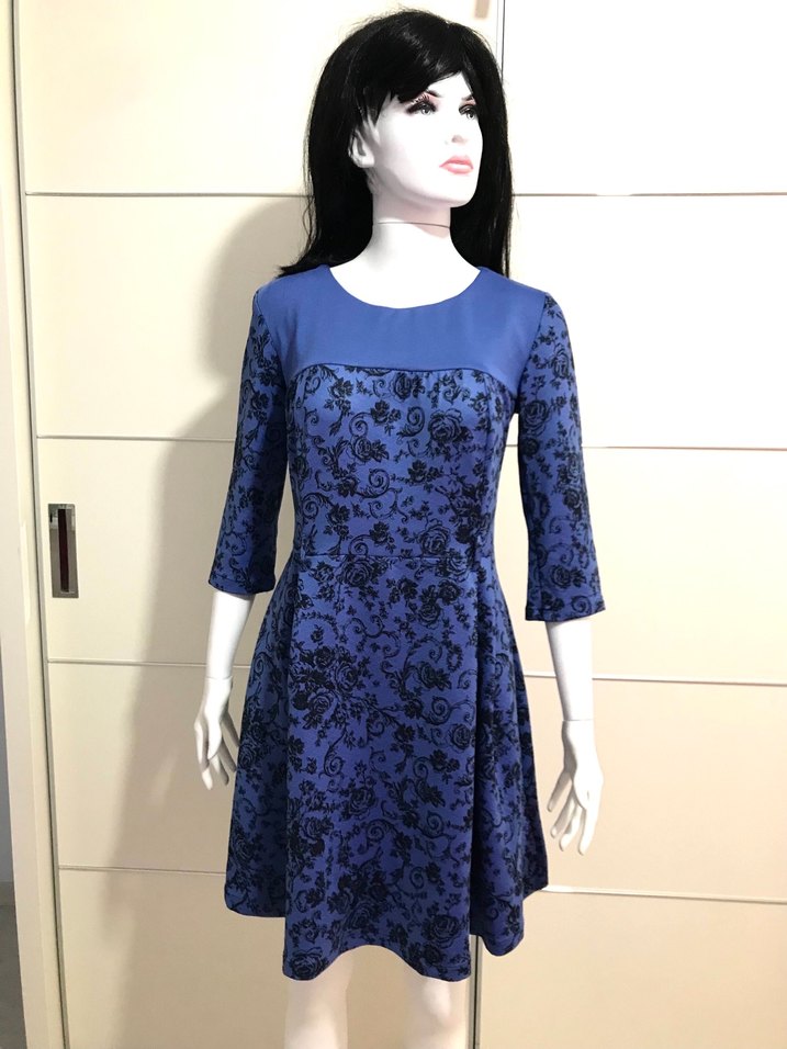 Lacivert renkli, uzun kollu, yuvarlak yaka ve dantelli baskılı midi elbise. Ofis için klasik şıklık sunar.
