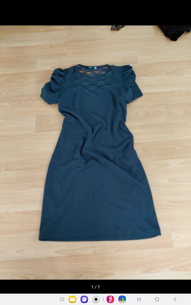 Lacivert renkte, kısa kabarık kollu, yuvarlak yaka ve dantel detaylı, düz desenli midi boy oturan elbisedir. Ofis kullanımı için uygundur.