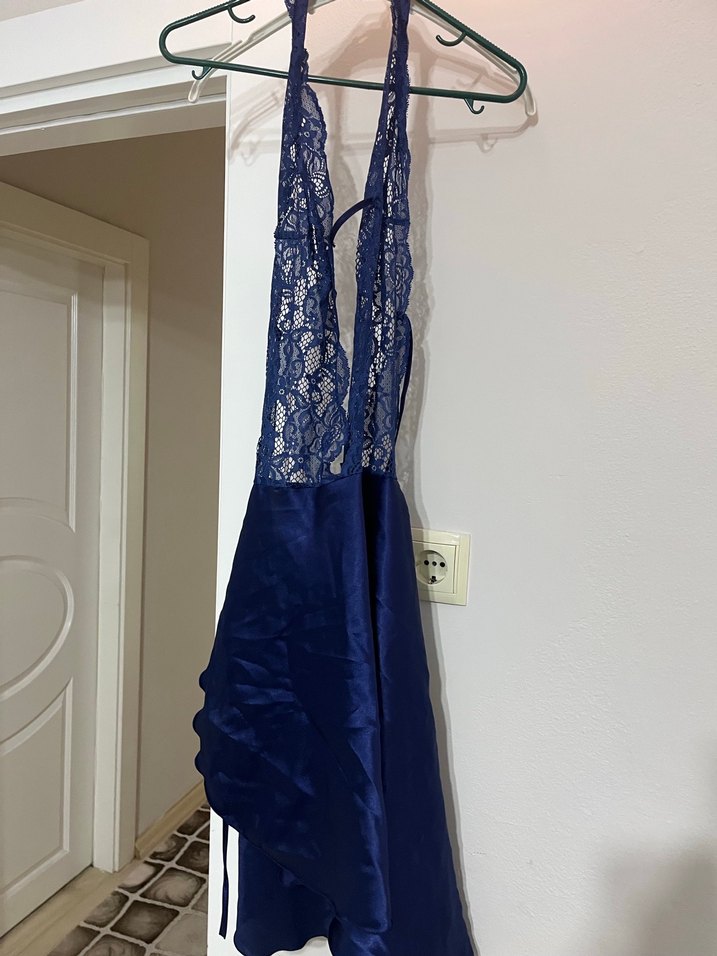 Lacivert renkli, dantel detaylı üst kısmı ve askılı tasarımıyla midi uzunlukta, bohem tarzda ve vücuda oturan kadın gecelik.