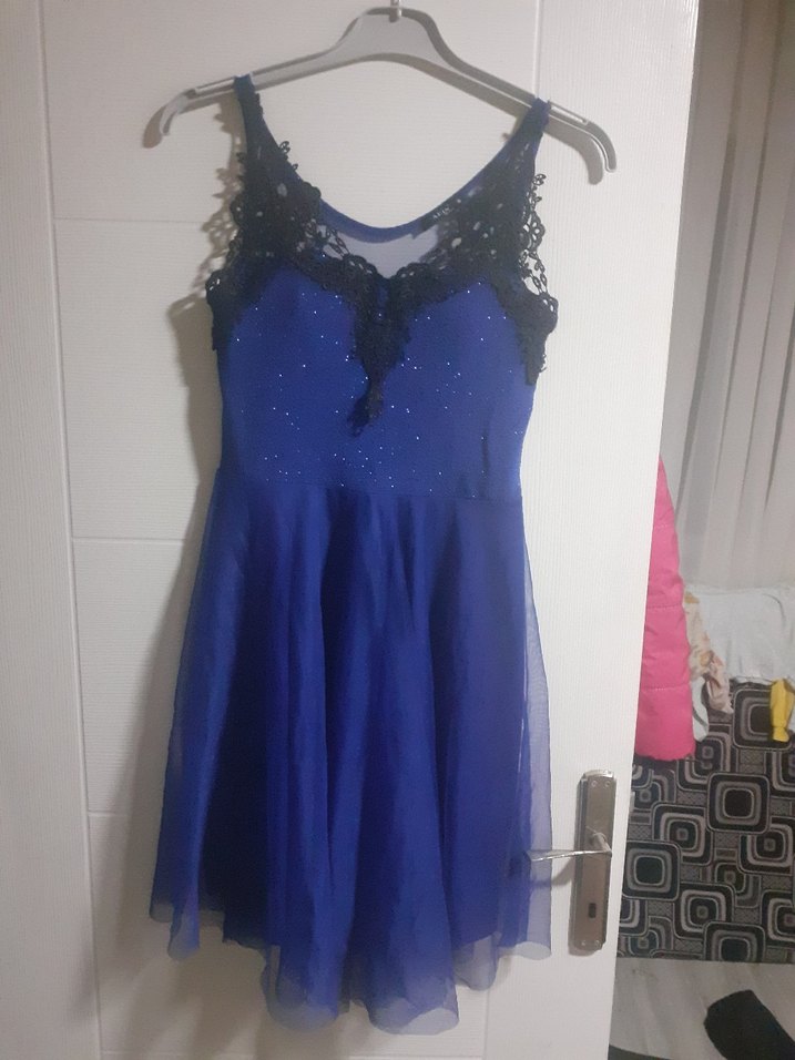 Fitted kesim, kolsuz mini abiye elbise, V yaka çevresinde dantel detaylarıyla lacivert renktedir. Desensiz tasarımı parti için uygundur, gotik ve avangart tarzda. ✨