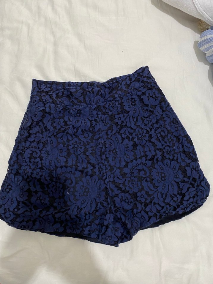 Dantel detaylı, lacivert, vücuda oturan mini şort. Tekstil kumaştan üretilmiş, cesur sokak stili için ideal.