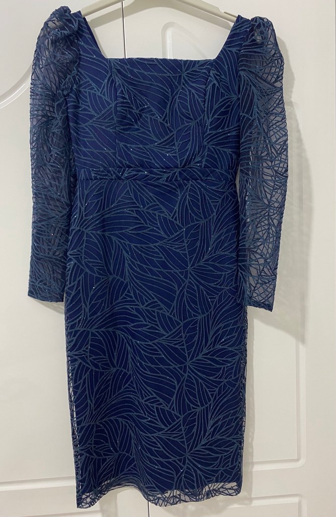Lacivert renkte, straplez yaka ve dantel detaylı uzun boy abiye elbise. Baskılı deseni ve vücuda oturan kesimiyle modern bir görünüm sunar.