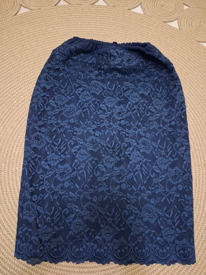 Sentetik kumaş üzerine lacivert dantel detaylı, uzun ve fitted kesim hamile eteği, rahat bohem tarzıyla açık hava kullanımı için uygundur.