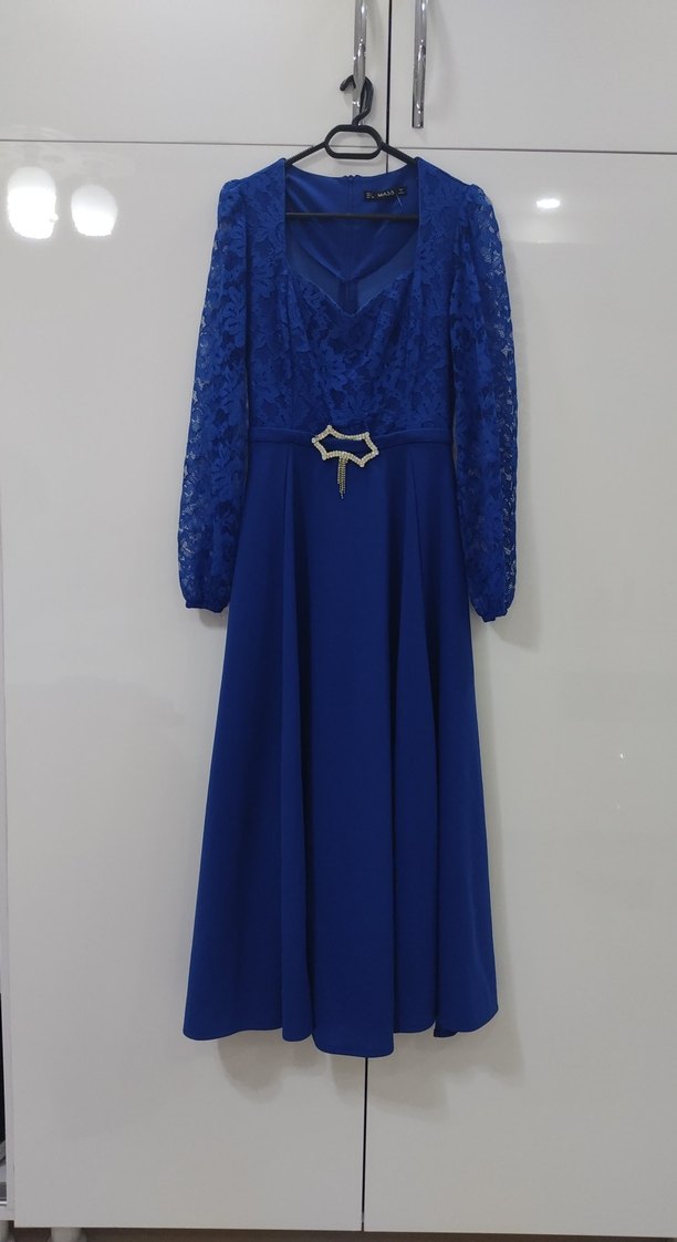 Lacivert uzun abiye elbise, dantel uzun kollu ve V yaka tasarıma sahiptir. Bol kesimi ve şık kemer detayıyla klasik düğünler için uygundur.
