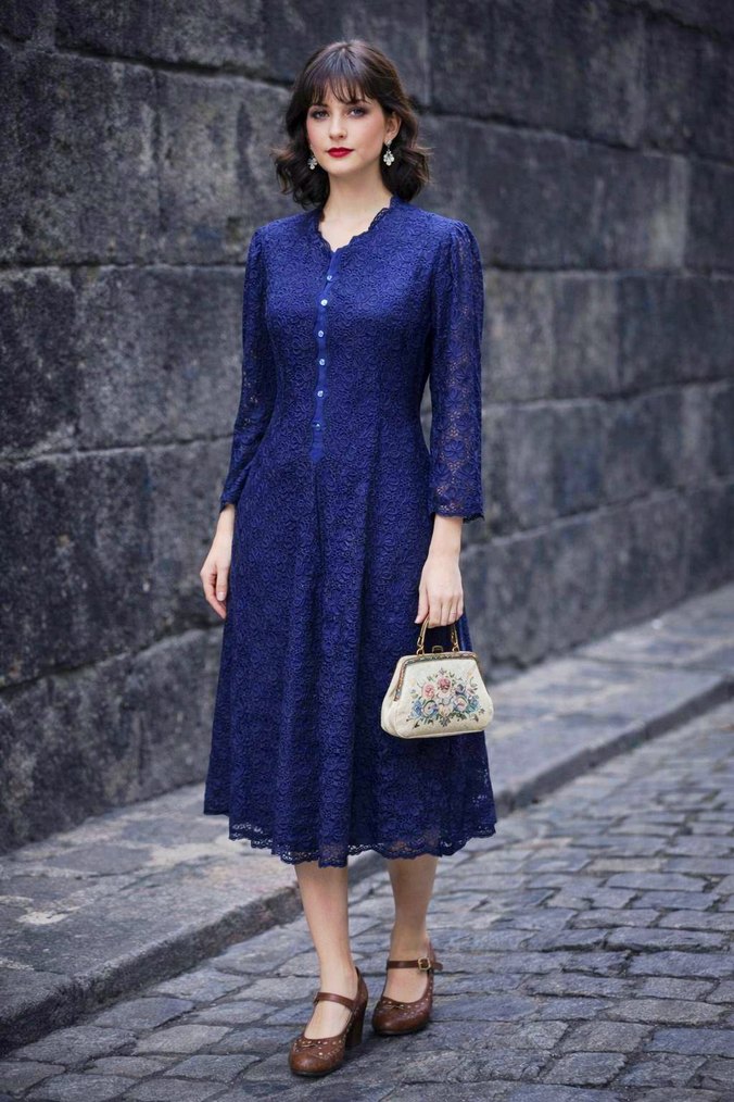 Lacivert, uzun kollu, dantel işlemeli vintage elbise, V yaka ve rahat kesimle klasik şıklık sunar.