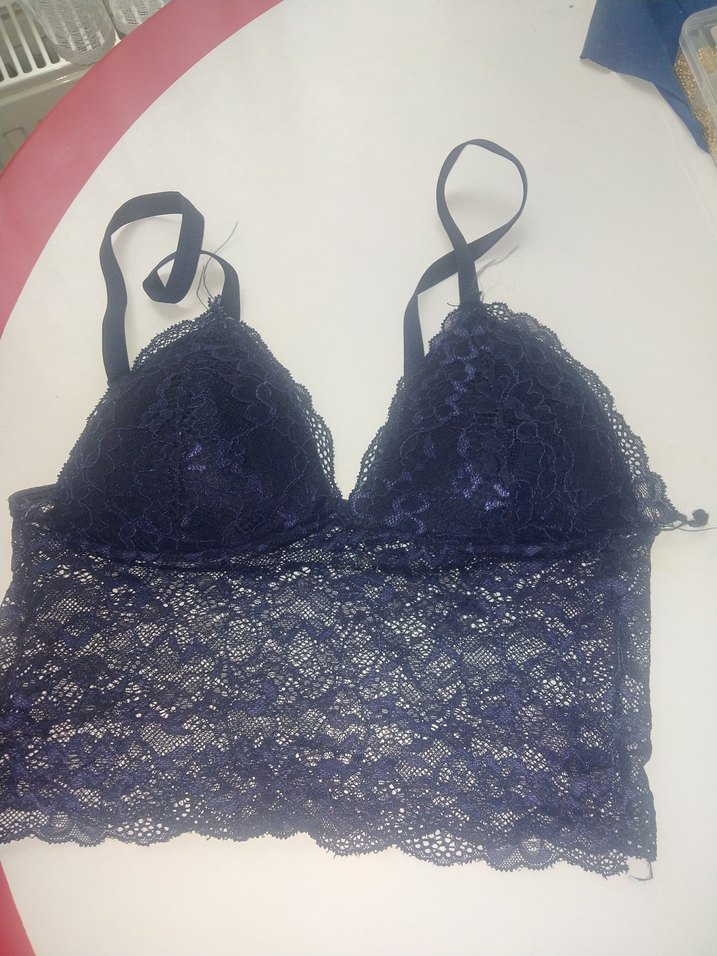 Lacivert renkte, gotik tarzda dantel kumaştan yapılmış bralet. Ayarlanabilir askıları ve midi uzunluğu vardır. Şık ve karanlık bir görünüm için uygundur.