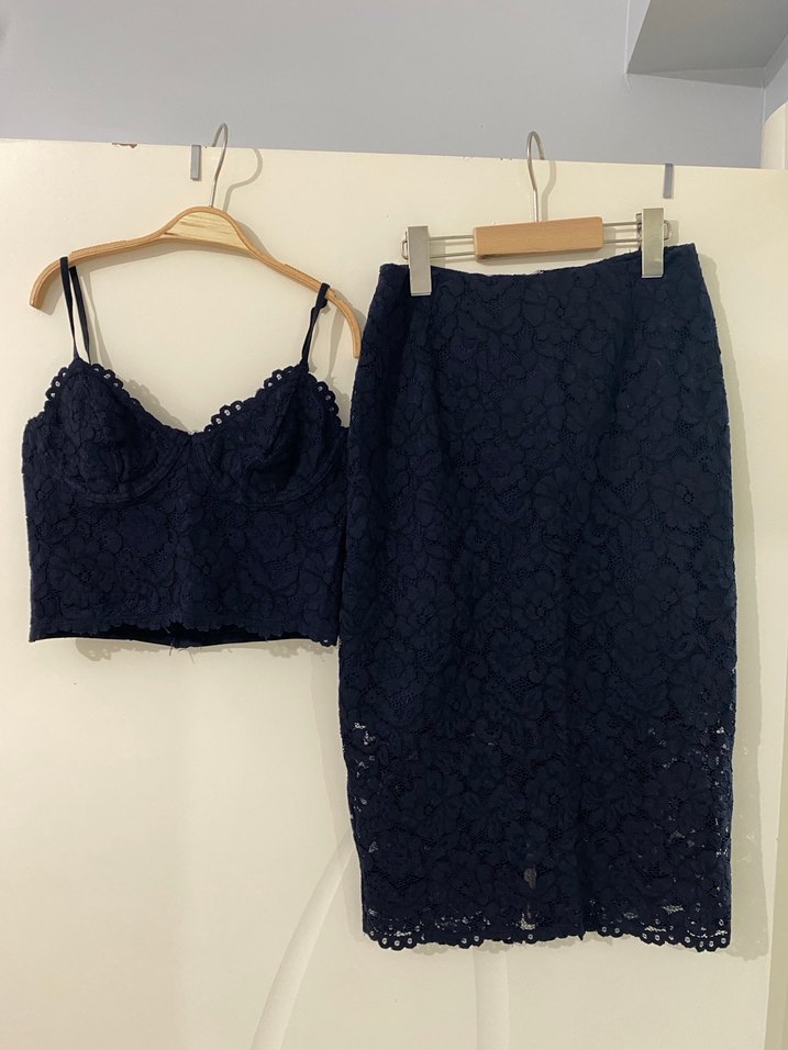 Lacivert Dantel İşlemeli Mini Büstiyer ve Etek Takım