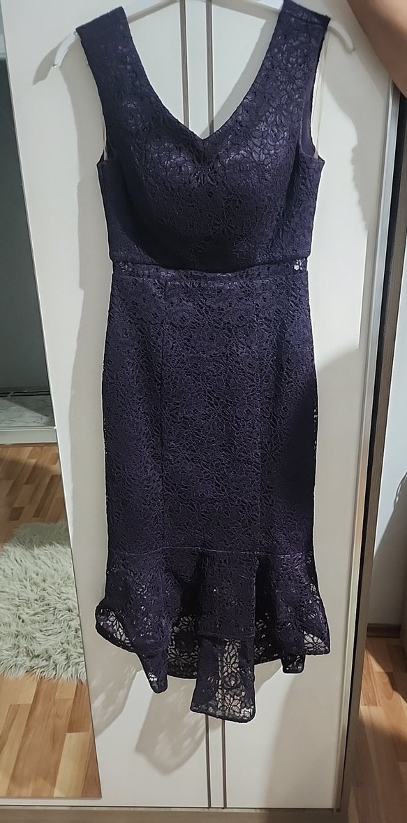 Lacivert dantel işlemeli, straplez yakalı, kolsuz ve vücuda oturan uzun abiye elbise, romantik akşamlar için uygun. sadece bir kere düğünde giyilmiştir.