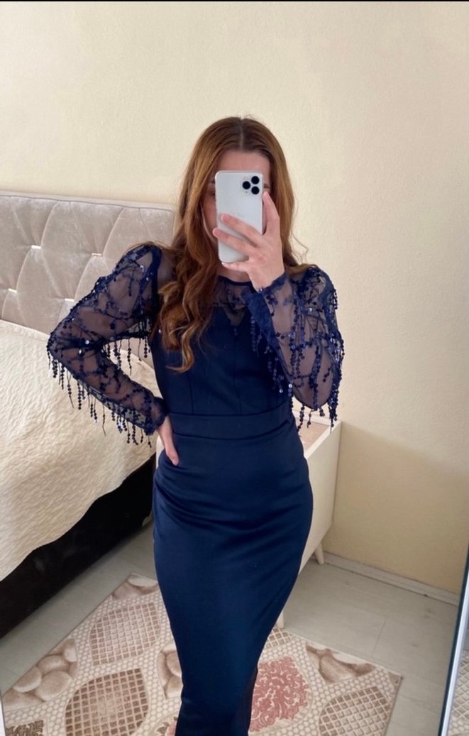 Lacivert Dantel İşlemeli Uzun Kollu Abiye Elbise