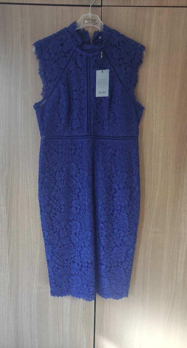 Lacivert renkte, dantel kumaşlı, yüksek yakalı, kolsuz ve midi boyda, vücuda oturan elbise. Ofis için uygundur. yurtdışından hediye geldi hiç giyilmedi