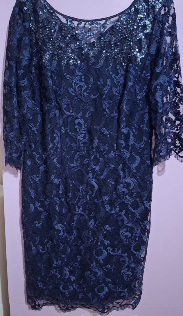 Lacivert renkte, dantel desenli, uzun kollu ve tekne yaka, vücuda oturan uzun abiye elbise. Düğünler için uygun, klasik ve gösterişli tarzda. 44 beden