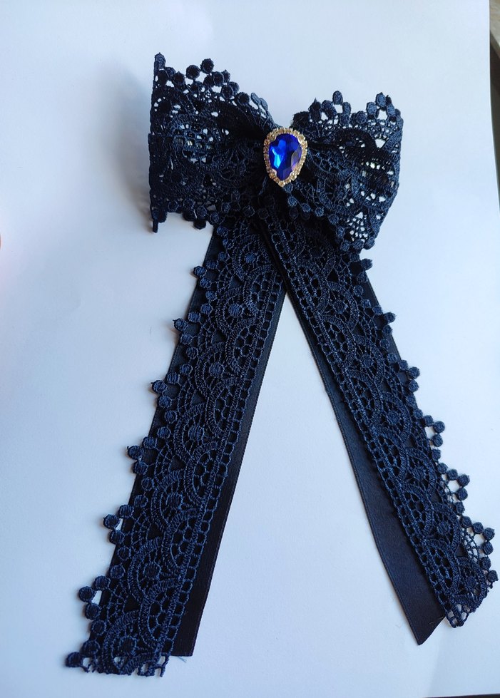 El yapımı dantel tasarım toka. Uzun kuyruk formu ve taş detaylı orta süslemesiyle özel bir modeldir. Klasik fiyonk modellerinden farklıdır.El yapımıdır