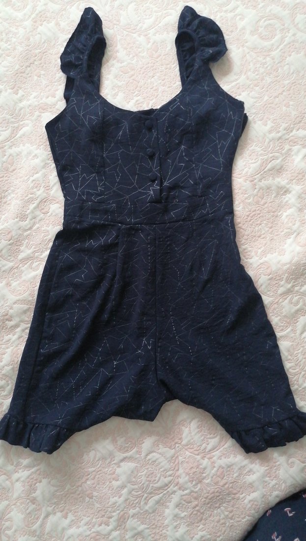 Lacivert kısa tulum, V yaka ve kolsuz tasarıma sahiptir. Dantelli detaylar ve hafif desenli, romantik akşamlar için uygun şık bir modeldir.