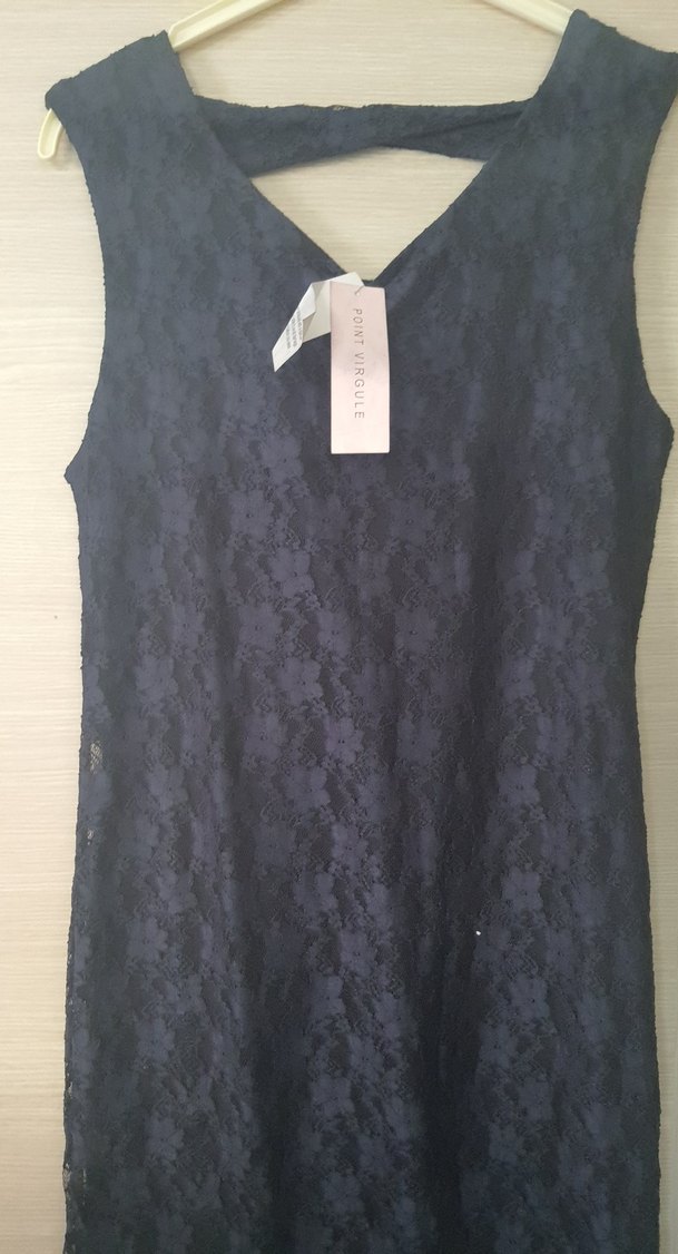 Dantelli, V yakalı, lacivert midi elbise. Fitted kesim ve baskılı gotik tarzıyla POINTVIRGULE markasına ait, romantik akşamlar için uygun.