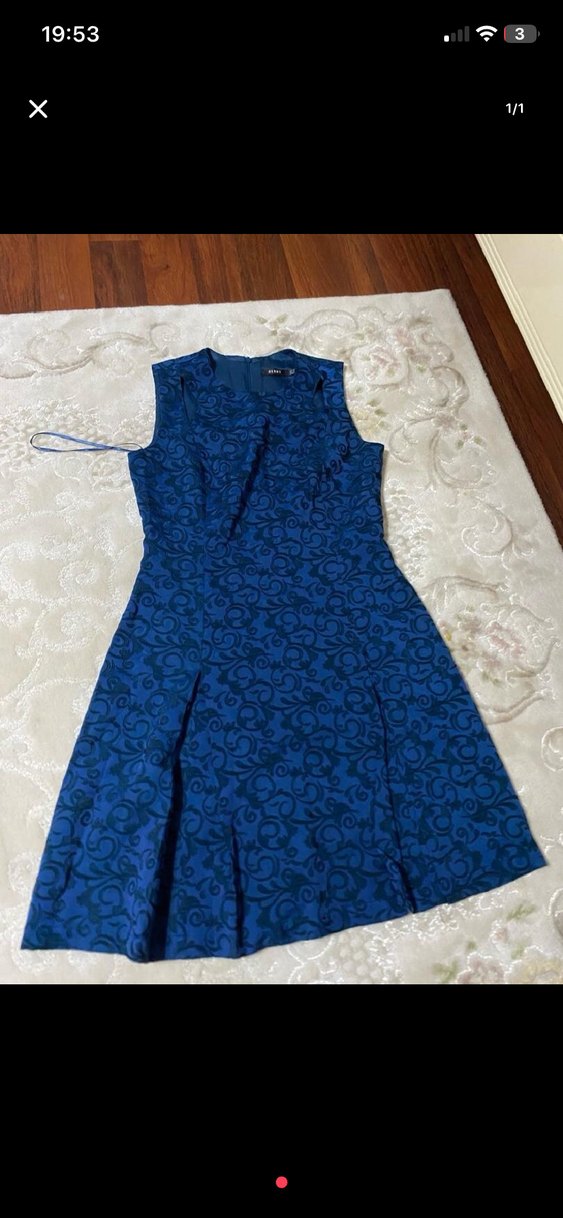 Kolsuz, lacivert midi elbise, v yaka ve dantelli detaylara sahip. Klasik vintage tarzıyla ofis kullanımı için uygundur.