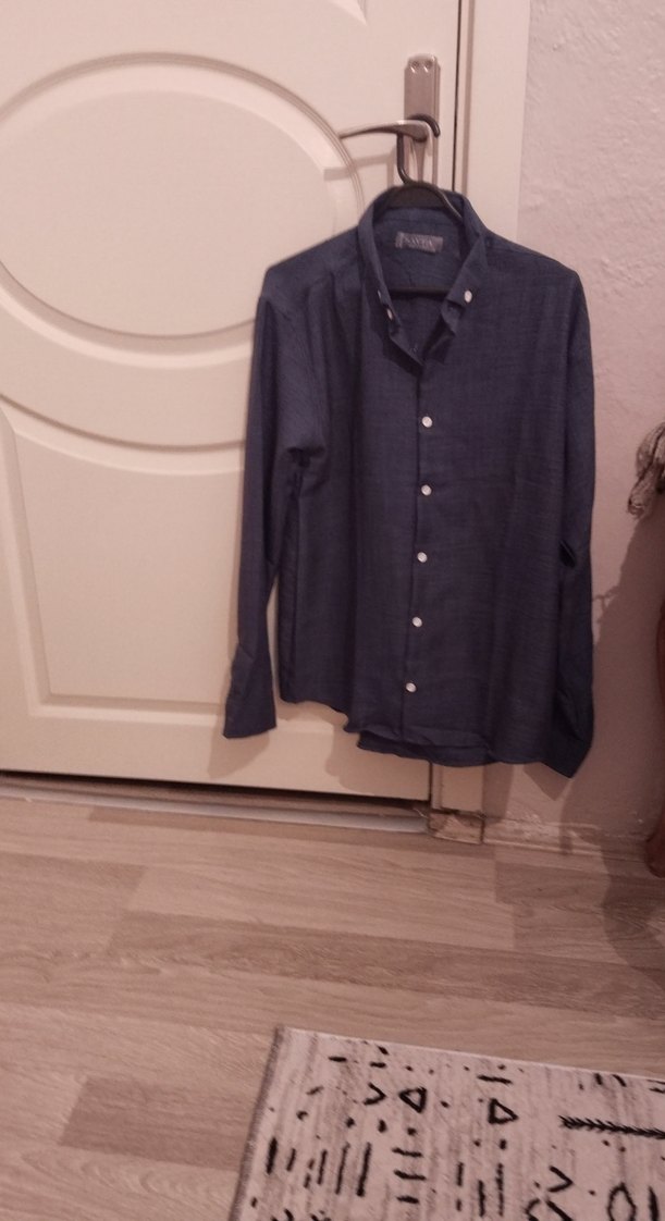 Düğmeli, yakalı ve uzun kollu lacivert denim erkek gömlek. Regular fit ve normal uzunlukta, ofis ve günlük sokak stili için uygundur.