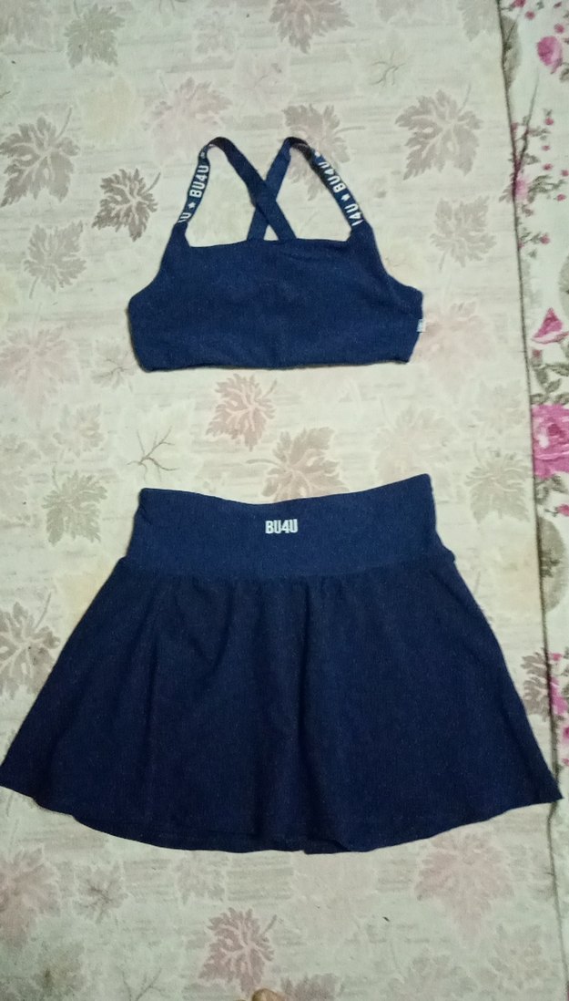 Koyu lacivert renkli, düz desenli, BU4U markalı dar kesim denim etek ve büstiyer takımı. Rahat ve şık bir sokak stili sunar.