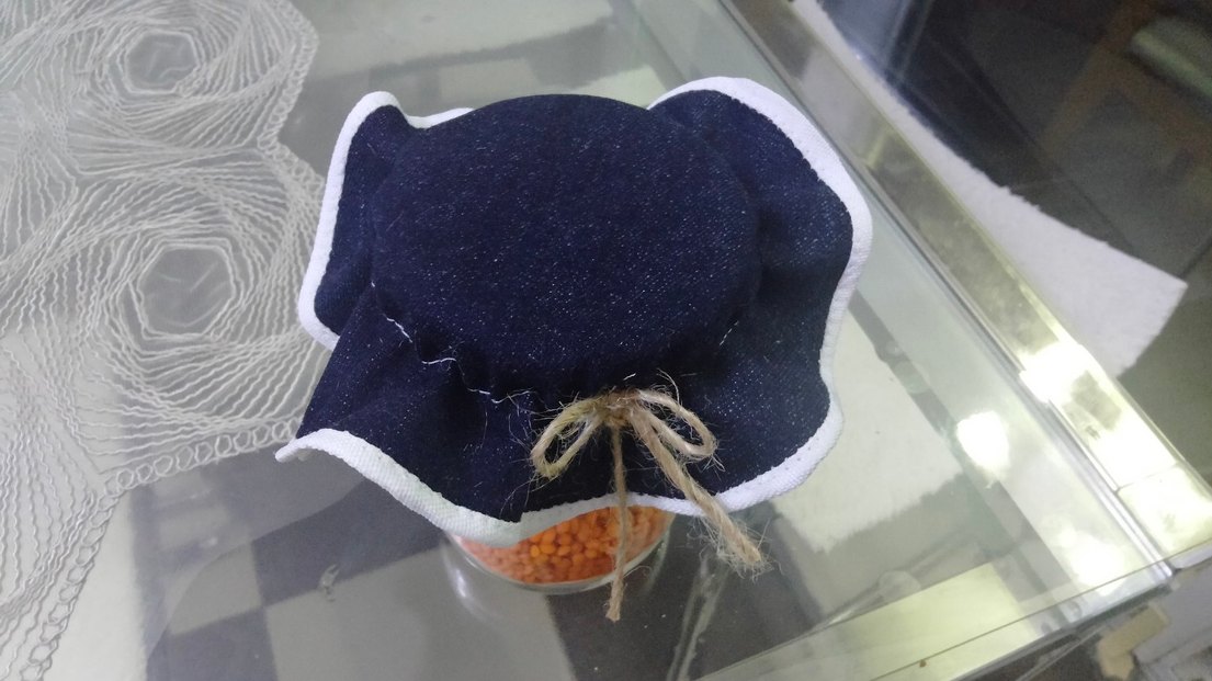 Lacivert renkte denimden yapılmış, fırfırlı kenarlara sahip bohem tarzda kavanoz örtüsü Doğal ipten bağcık detayı bulunur. 6 adet fiyatı dır