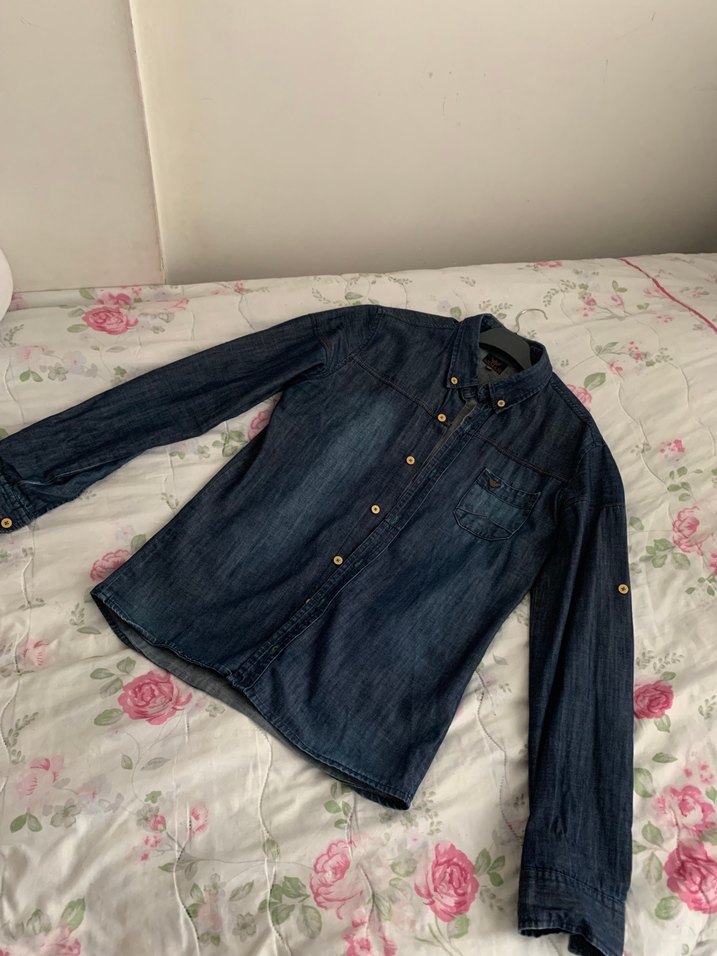 Lacivert denim kumaştan, uzun kollu ve yakalı, düğmeli rahat kesim gömleği. Günlük kullanım için uygun, sokak stiliyle uyumlu.