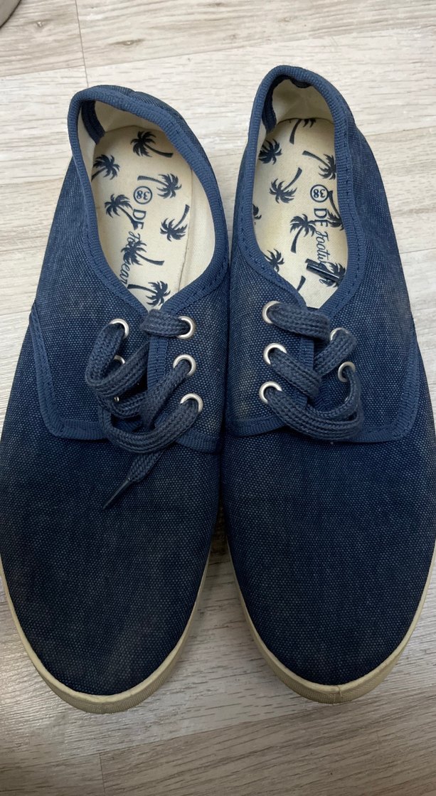 Lacivert denim kumaştan yapılmış, dolgu topuklu ve düğmeli detaylara sahip kadın spor ayakkabısı. Günlük rahat kullanıma uygun, desen içermeyen koyu renk tasarım.