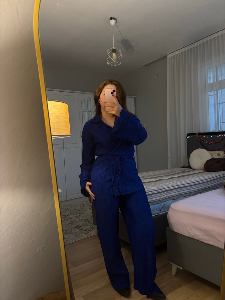 Lacivert denim kumaştan yapılmış, normal midi boyda, bol kesim kadın takım elbise. Uzun kollu, yakalı ve desen içermeyen bu parça, ofis için rahat ve şık bir tercih sunar.