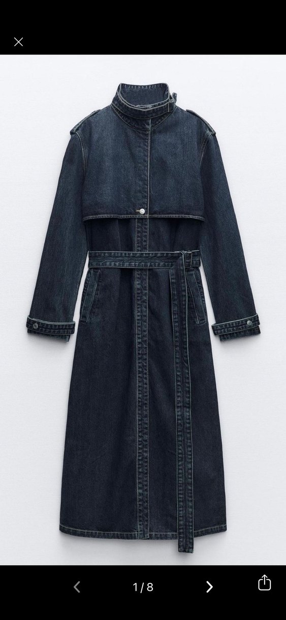 Lacivert denim kumaştan, kemerli ve uzun kesim kadın trençkot. Minimalist tarzda, notched lapel yakalı ve strappy kolludur. Günlük şık kullanıma uygundur.