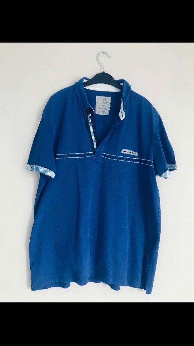 Lacivert denim kumaştan, yakalı ve düğmeli ön kısmı olan, rahat kesim ve normal boyda günlük kullanıma uygun polo tişört.
