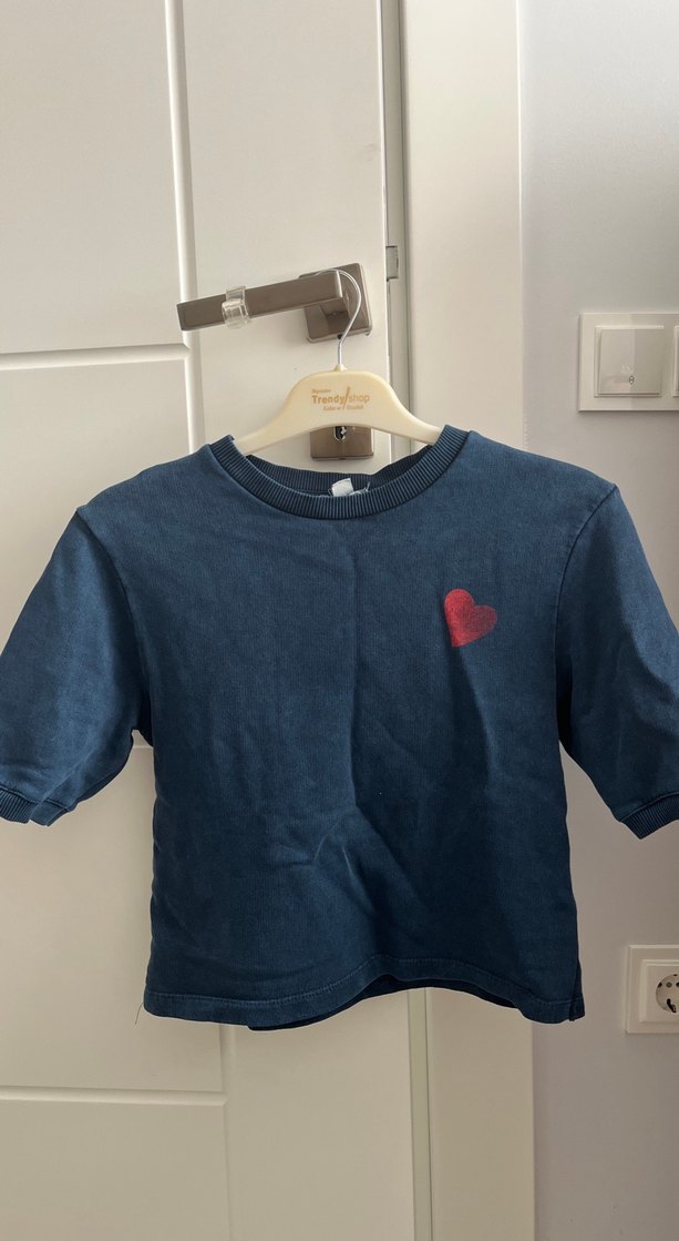 Koyu mavi denim kumaştan, bol kesim ve kısa kollu . Yuvarlak yaka ve küçük kırmızı kalp baskılı detayla rahat şıklık sunar. Bedeni yok ama ben s giyerken bana kolaylıkla oluyordu şimdi maalesef kilo aldığım için satışta