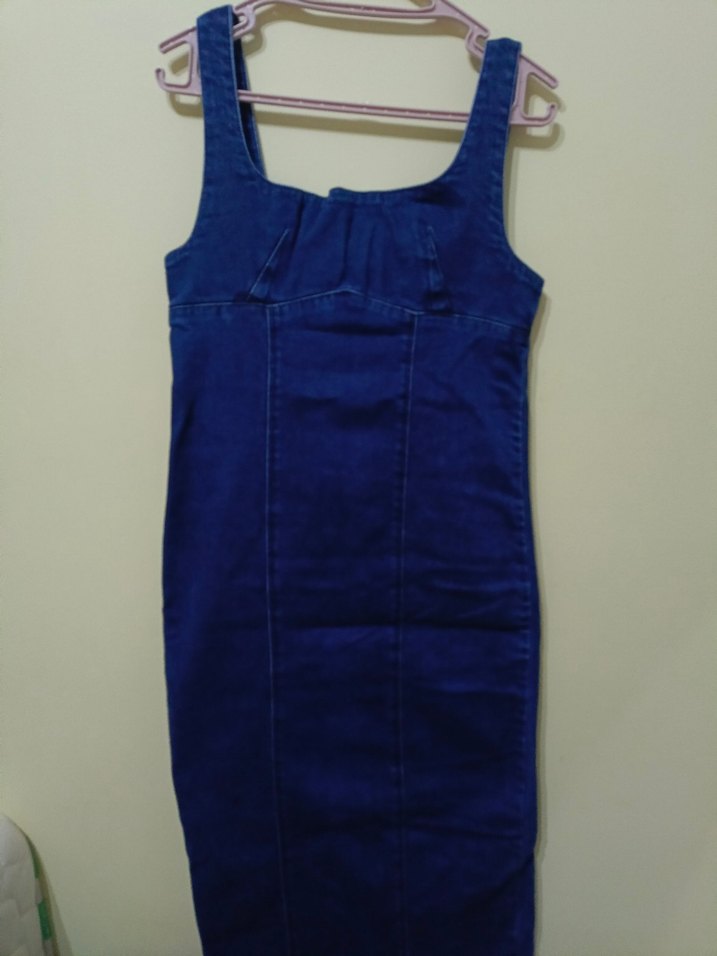 Lacivert denim kumaştan, askılı ve dar kesim midi elbise. Minimalist tasarımıyla günlük kullanıma uygun şık bir modeldir.