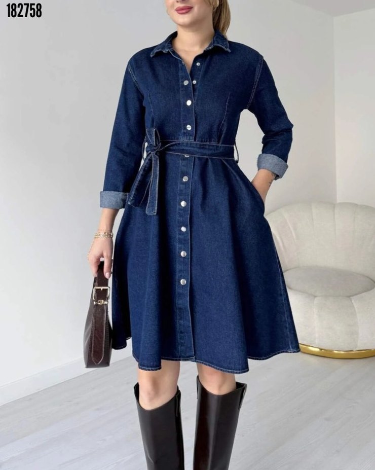 Lacivert denim midi elbise, yakalı, düğmeli, kemerli ve rahat kesim. Günlük sokak stili için uygun. Ürün Açıklaması Boydan Çıtçıtlı Kemerli Kot Elbise İndigo Modelin Ölçüleri: Boy:165, Kilo:55, Göğüs:90, Bel:72, Kalça: 100 Modelin üzerindeki ürün M/38 bedendir. Ürün ID 182758