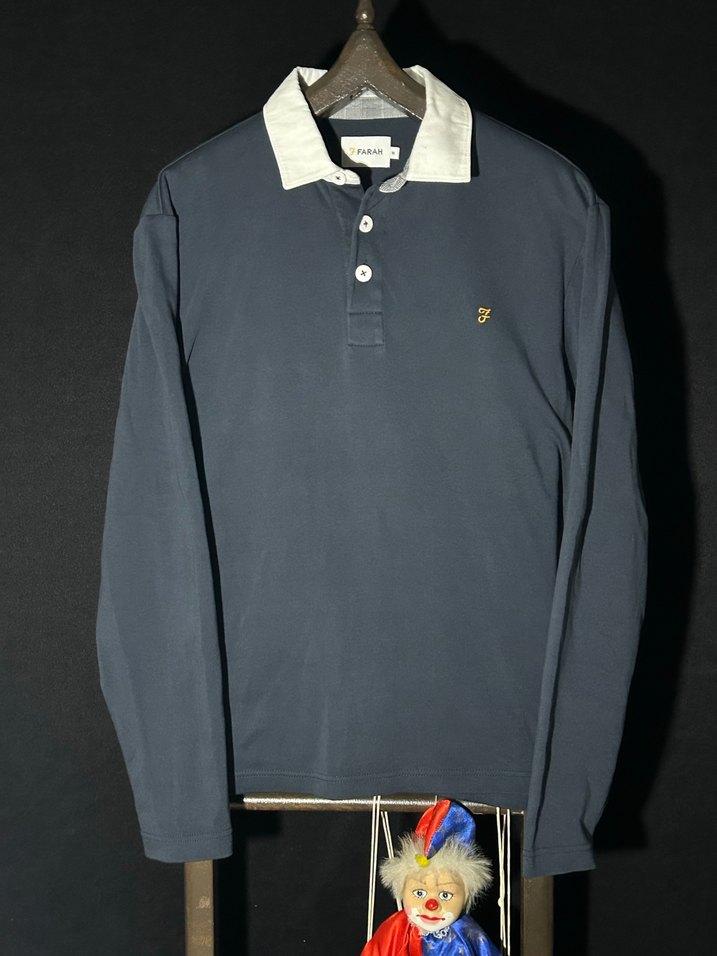 Gri renkte, denim kumaştan üretilmiş, düğmeli polo yaka ve uzun kollu, vücuda oturan erkek tişört.ofis için uygun. •Temiz ve kusursuz kondisyonda