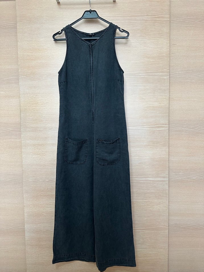 Kolsuz, uzun kesim lacivert denim tulum, normal kesim ve fermuarlı. Yuvarlak yaka ve önünde iki cep bulunur, günlük rahat kullanıma uygundur.