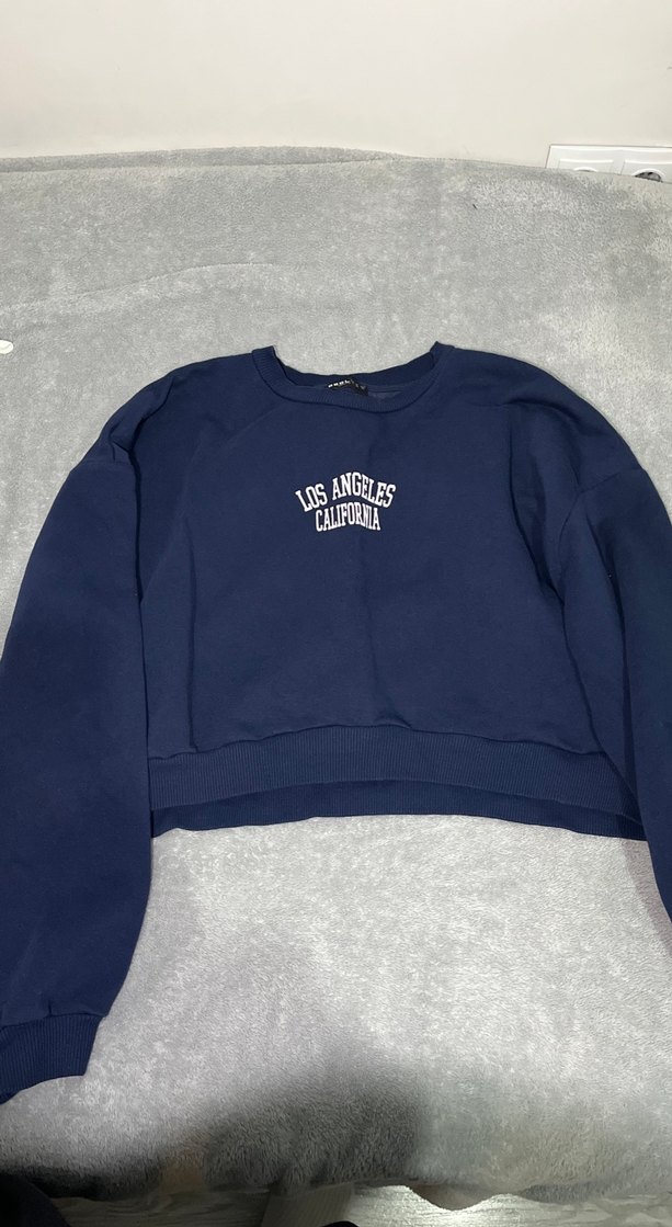 Lacivert denim kumaştan, uzun kollu ve yuvarlak yakalı. 'Los Angeles California' baskılı, rahat kesim. Günlük kullanıma uygun şık sokak stili.