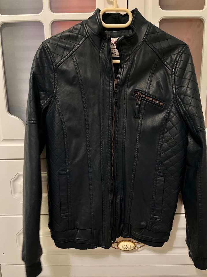 Lacivert deri, biker tarzı, normal kesim, fermuar detaylı mont. Normal boy, 12-13 yaş, sorunsuz LCW deri mont.
