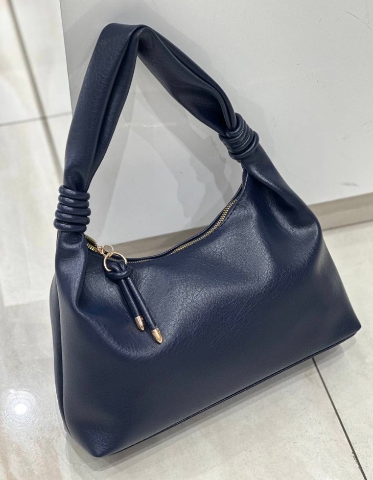 Lacivert parlak deri kadın çanta, püskül detayı ve minimalist çağdaş tasarıma sahip. Klasik zarafet için uygun.