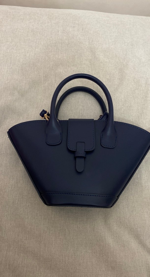Lacivert deri kadın çanta, tokalı kapak ve yapılandırılmış tasarıma sahiptir, günlük kullanım için uygundur ve çağdaş bir stile sahiptir.