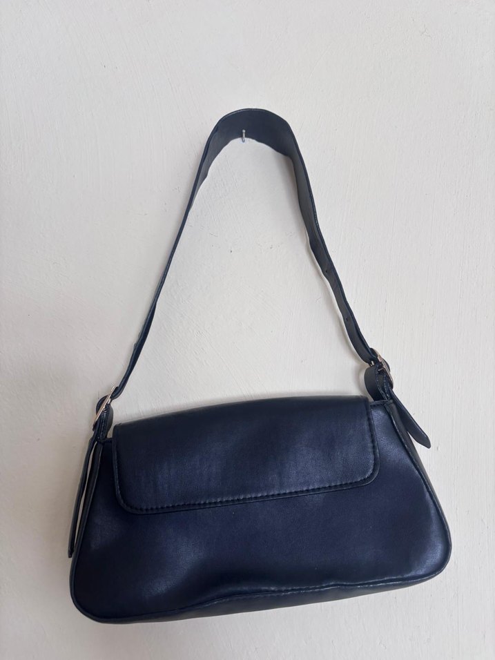 Lacivert renkli, deri malzemeden yapılmış kadın omuz çantası, tokalı kayışıyla sade ve minimalist bir tasarıma sahiptir. Günlük sokak stili için uygundur.