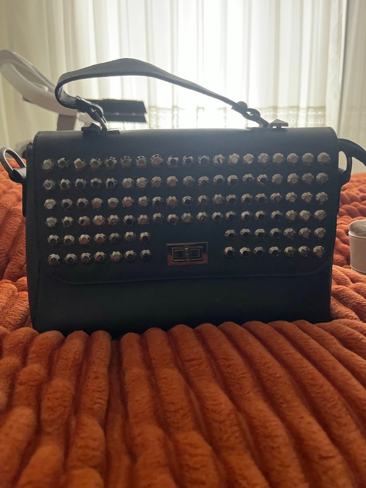 Gümüş perçinlerle süslenmiş, tokalı kapaklı lacivert deri çanta. Rock punk tarzı, günlük kullanım için uygundur.