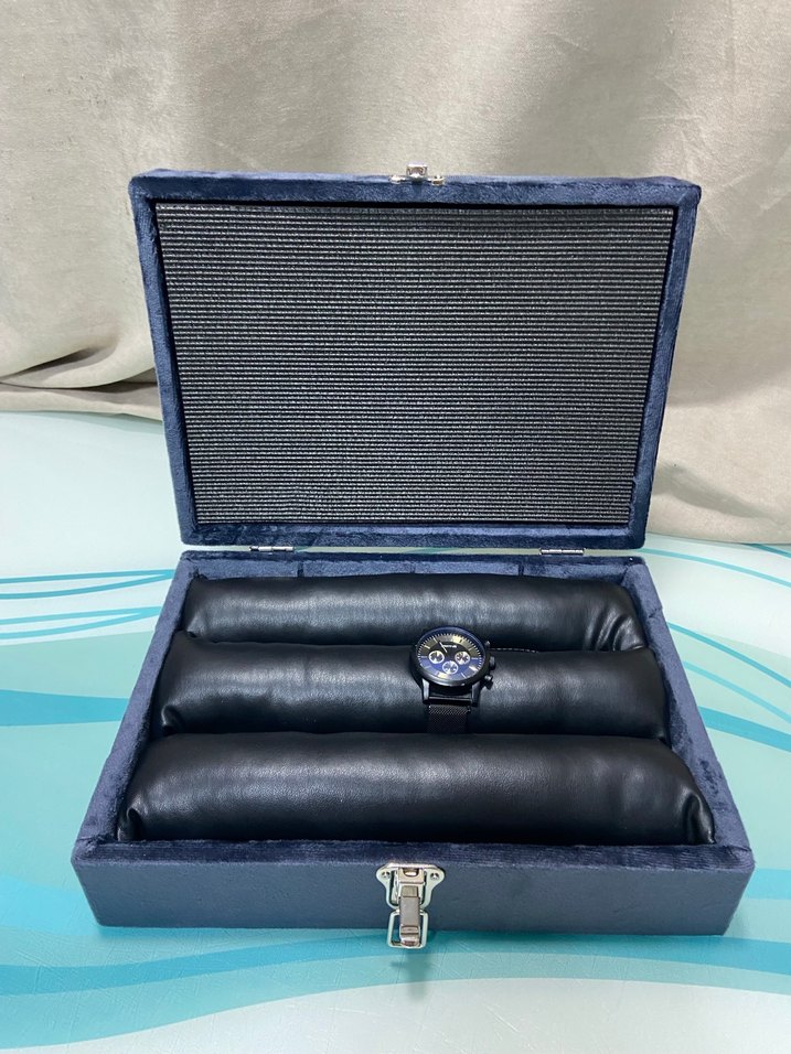 Lacivert dış yüzeyi ve deri yumuşak yastıklarıyla saatler için tasarlanmış kapaklı düzenleyici kutu. Güvenli saklama sağlar. ⌚