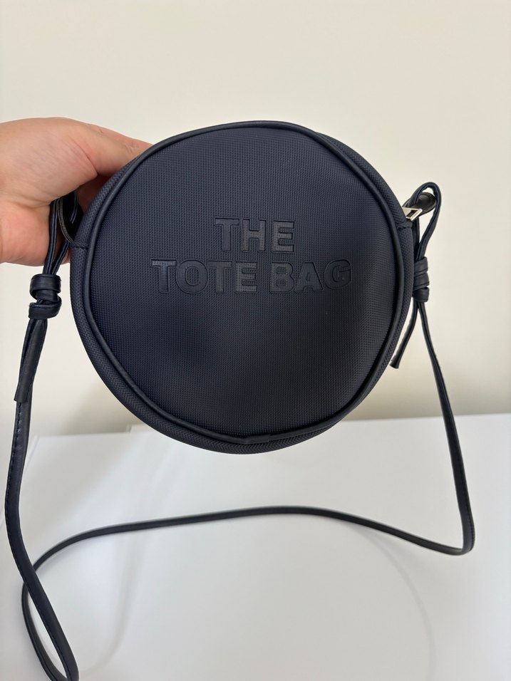 Siyah deri yuvarlak çanta, elastik detaylar ve 'THE TOTE BAG' baskılı logo içerir. Sokak stili ve günlük kullanım için uygundur.