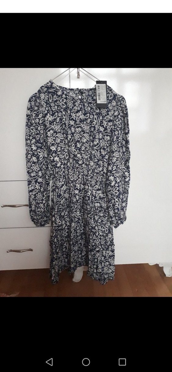 Lacivert renkte, beyaz desenli bohem tarzı mini elbise. Uzun kollu, V yakalı ve düğmeli tasarıma sahiptir. Sentetik kumaştan yapılmıştır ve rahat bir kesime sahiptir.